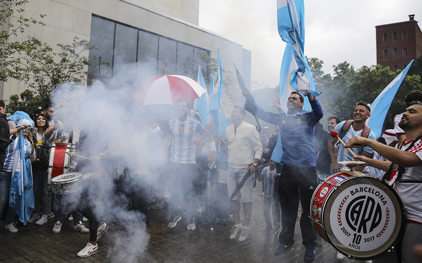 No importó el mal clima. Los argentinos se hicieron la movida igual, a pesar de la llovizna, aunque no pudieron ver a ningún jugador: es que después del entrenamiento de la mañana, Jorge Sampaoli les había otorgado una licencia hasta hoy a la noche, cuando deban regresar a dormir allí. Por lo tanto, ninguno de los 23 integrantes del plantel salió a la puerta.