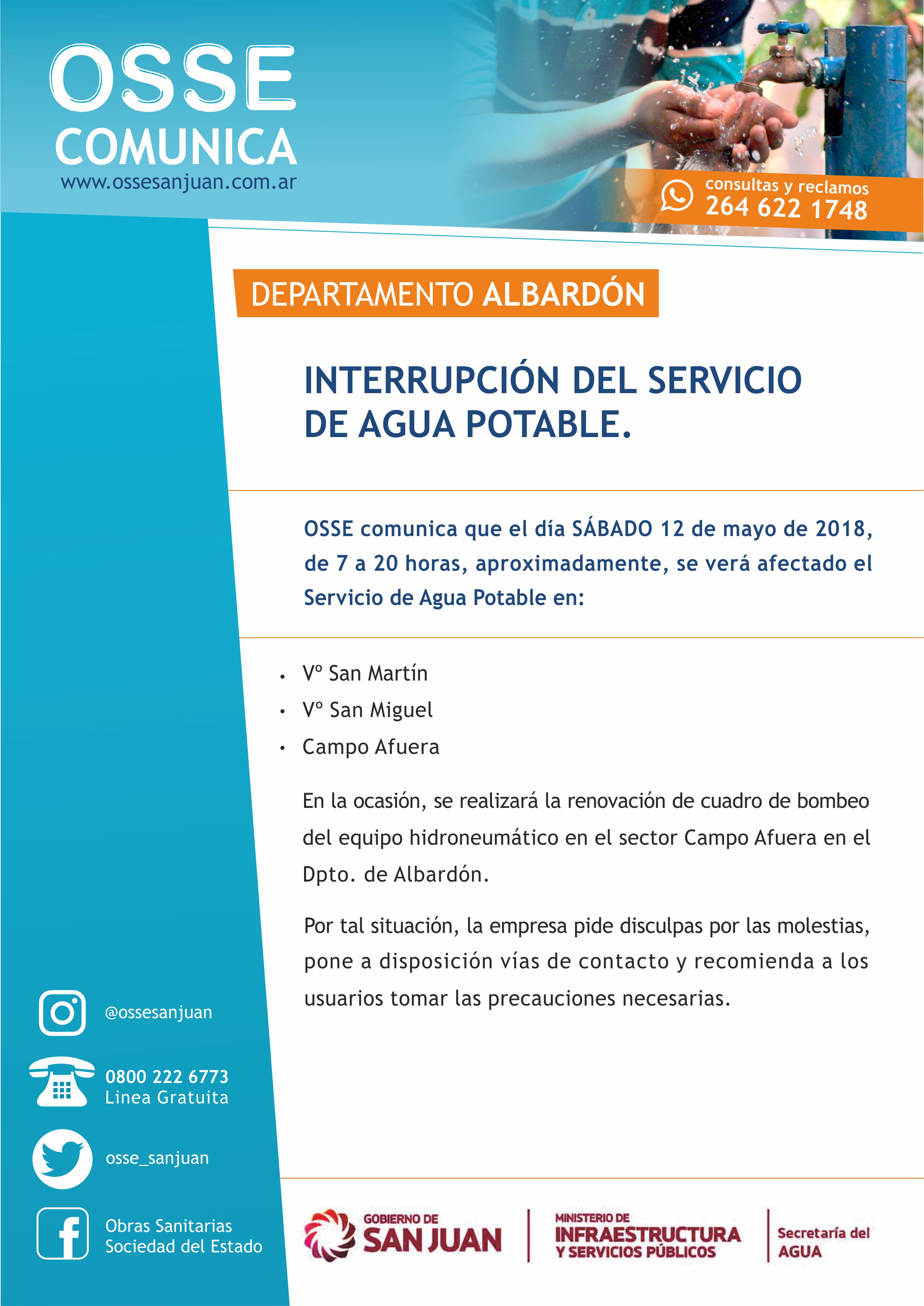Diario de Cuyo | HOME | Noticias | Albardón Gran parte de Albardón no tendrá agua potable durante todo el día Por Redacción Diario de Cuyo 08/05/2018 · 0:00 Escuchar la noticia Escuchar la noticia Your browser doesn’t support HTML5 audio Albardón OSSE Ver los comentarios ›
