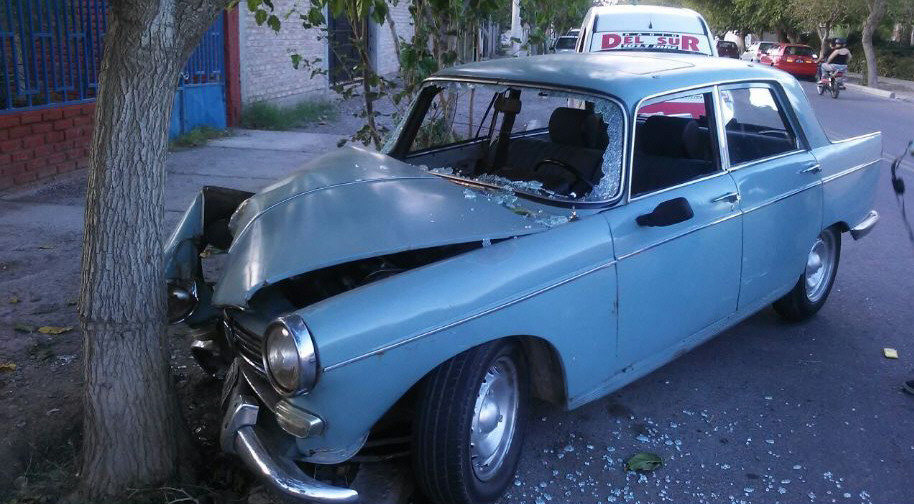 Una pareja terminó con lesiones menores ayer, alrededor de las 15, cuando transitaban en un viejo Peugeot 404 y se estrellaron contra una mora en inmediaciones de Alvear y Cenobia Bustos, Rawson. Según la Policía, chocaron porque al vehículo se le rompió la dirección.