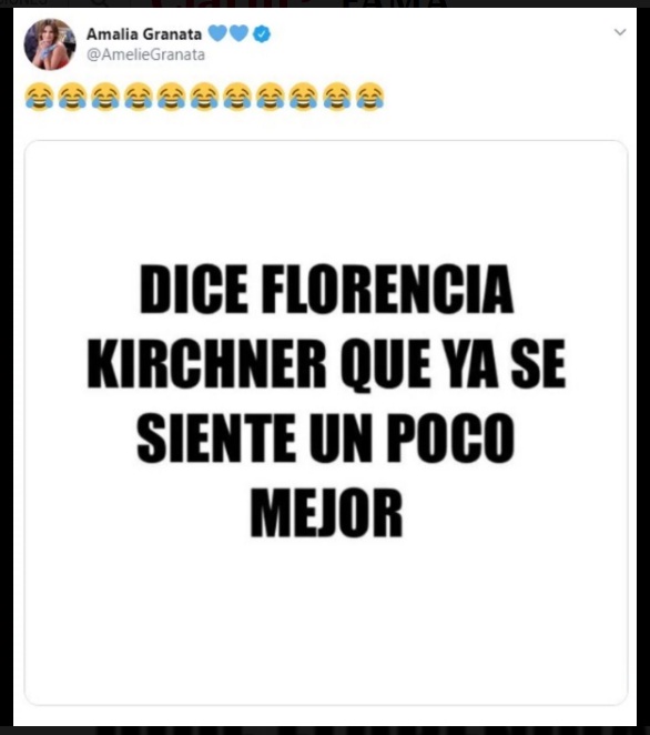 Es que, con los primeros números del escrutinio provisorio de lasPASO, que marcaban una considerable diferencia a favor de la fórmula Fernández-Fernández, la ex modelo devenida en diputada tuiteó: "Dice Florencia Kirchner que ya se siente un poco mejor".