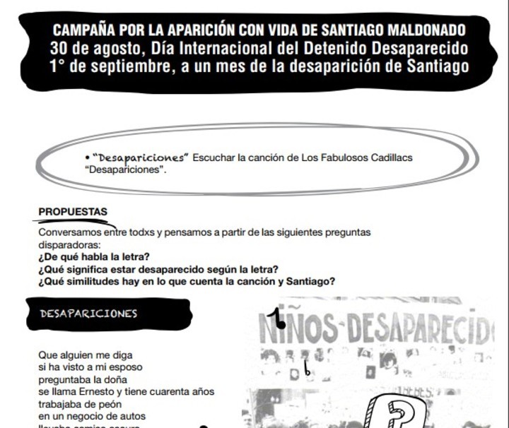 Para Primaria, por ejemplo, la indicación pedagógica comienza por escuchar con los chicos la canción "Desapariciones" de Los Fabulosos Cadillacs. Luego propone: "Conversamos entre todxs y pensamos a partir de las siguientes preguntas disparadoras: ¿De qué habla la letra? ¿Qué significa estar desaparecido según la letra? ¿Qué similitudes hay en lo que cuenta la canción y Santiago?".