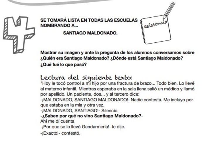 El caso de Santiago Maldonado será tema de estudio y reflexión en los próximos días en escuelas de todo el país. Así lo pretenden al menos los principales gremios docentes del país, que comenzaron a distribuir entre sus afiliados polémicos materiales didácticos donde proponen hablar del joven como un "detenido desaparecido" a quien "se lo llevó la Gendarmería", pese a que eso aún está siendo investigado.