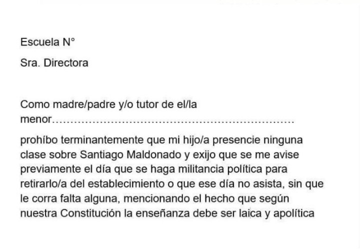 El modelo de carta que circula en las redes para evitar que los chicos participen de clases "especiales" sobre Santiago Maldonado.