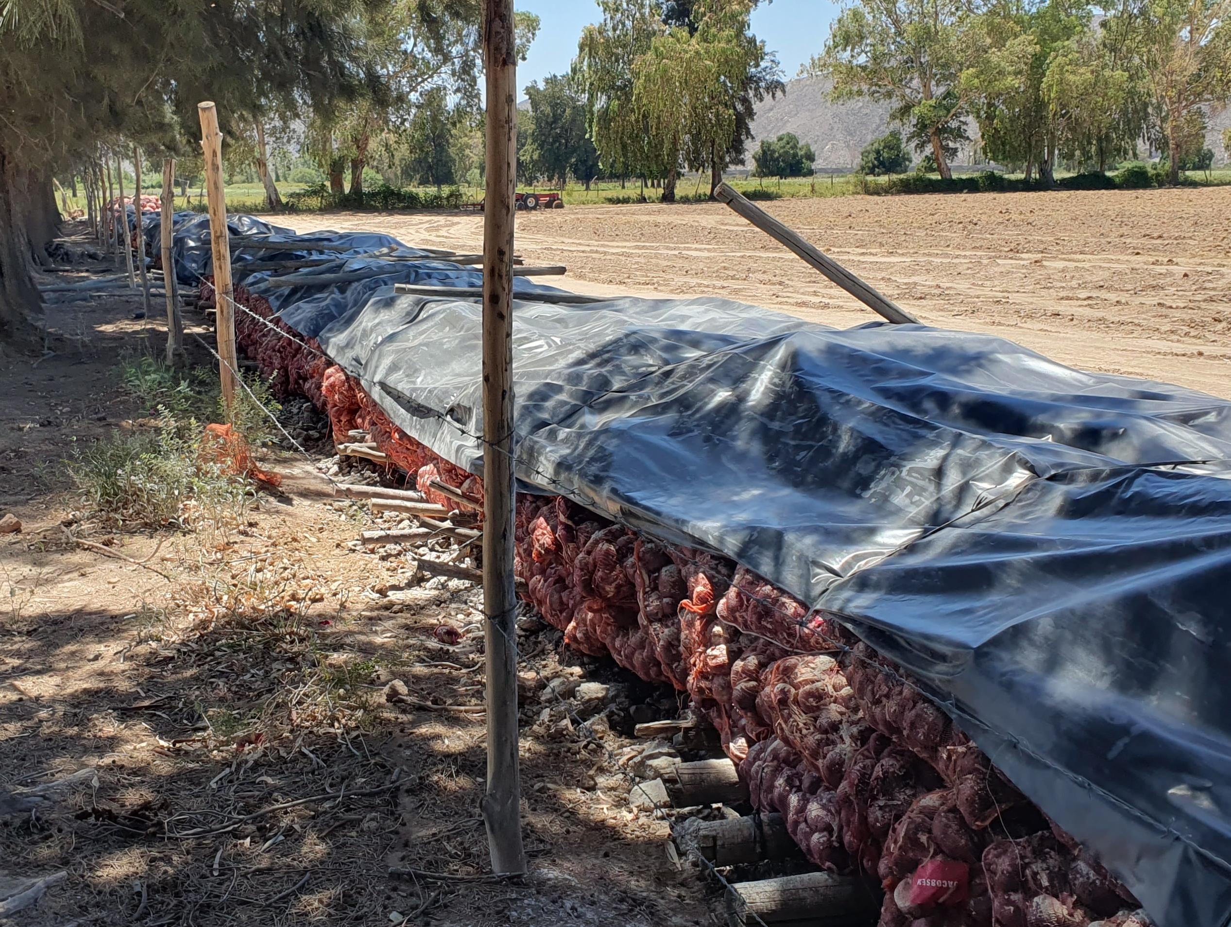 En fotos de la nota se pueden ver sistemas actuales. La amenaza es la lluvia, ese factor causa pérdidas variables según sea el verano llovedor o no, y el productor haya hecho un buen sistema de conservación de bulbos.