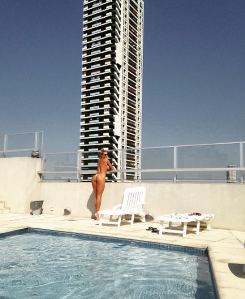 El calor se hace sentir en la mayor parte del país y Buenos Aires no está entre las excepciones. Agobiada, la vedette Pamela Pombo decidió hacerle frente a la ola tropical con una diminuta bikini y haciendo topless al borde de la pileta en su terraza.