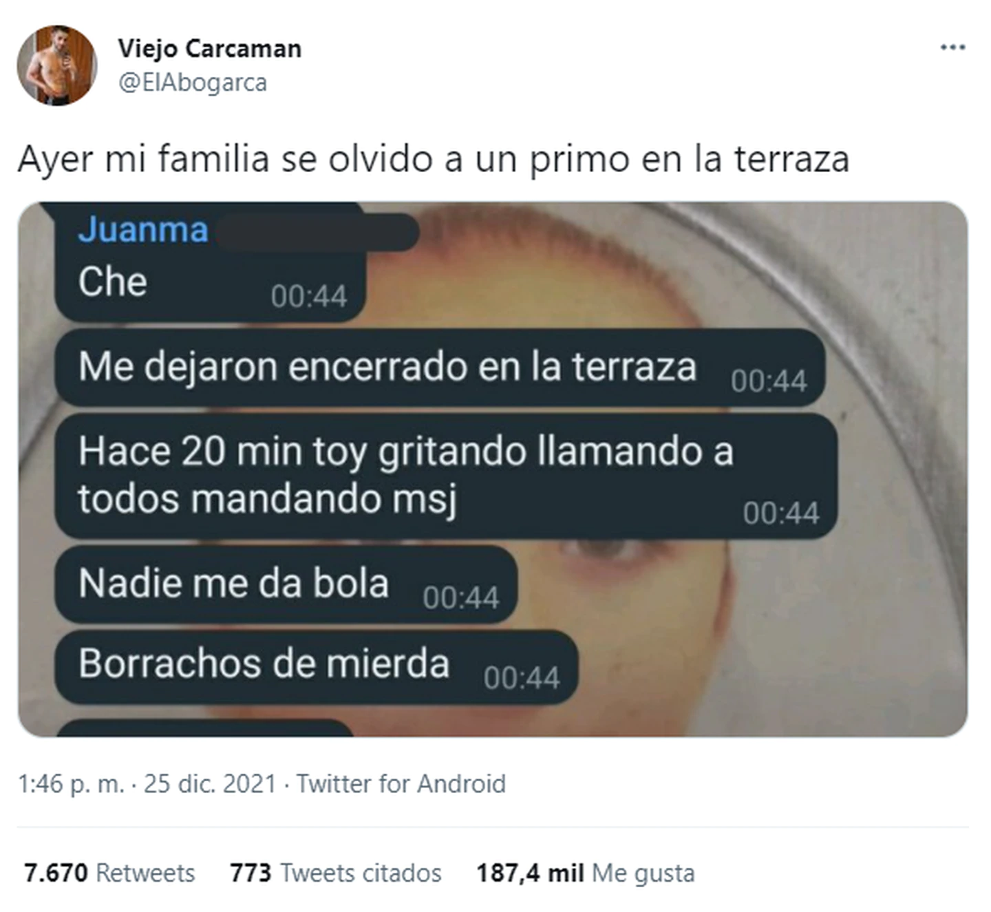 Su primo Antonio no pasó la Navidad con él, pero siguió la divertida situación por el grupo familiar de WhatsApp y no dudó en compartirlo en Twitter, donde se hizo viral: “Ayer mi familia se olvidó a un primo en la terraza” publicó y acompañó con una captura del chat familiar. “Che, me dejaron encerrado en la terraza. Hace 20 minutos que estoy gritando, llamando, nadie me da bola. Borrachos de mierda”, dicen los mensajes que Juan envió en esos momentos de deseperación.