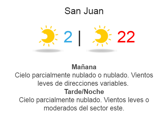 El mes de agosto sigue con buen tiempo en San Juan. El frío golpea bien temprano y a la noche, y sigue entregando jornadas templadas durante el día. Para este sábado, el Servicio Meteorológico Nacional anuncia una máxima de 22°, con cielo totalmente despejado.