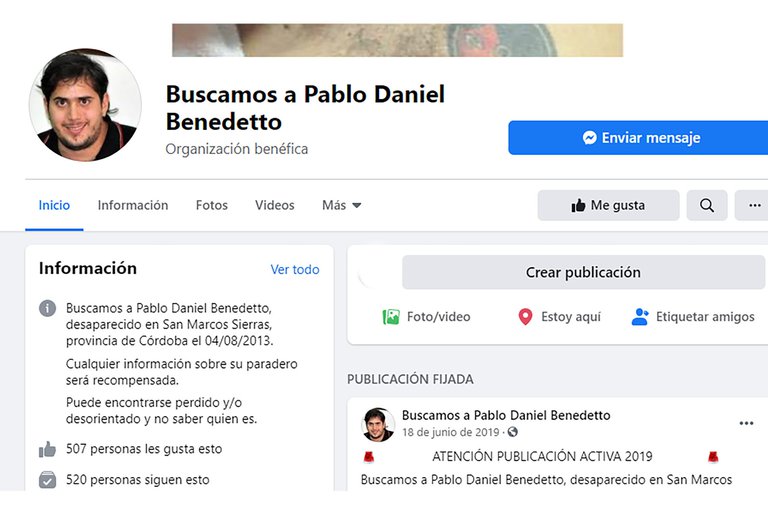 El grupo de Facebook se llama “Buscamos a Pablo Daniel Benedetto”. En la foto de perfil, el joven rosarino de 28 años sonríe mirando a cámara con una camiseta de Newell’s. Más abajo, un pedido de auxilio que se repetía desde el sábado 3 de agosto de 2013: fecha en que Pablo desapareció mientras vacacionaba con su mujer y su hijo en San Marcos Sierras en la provincia de Córdoba.