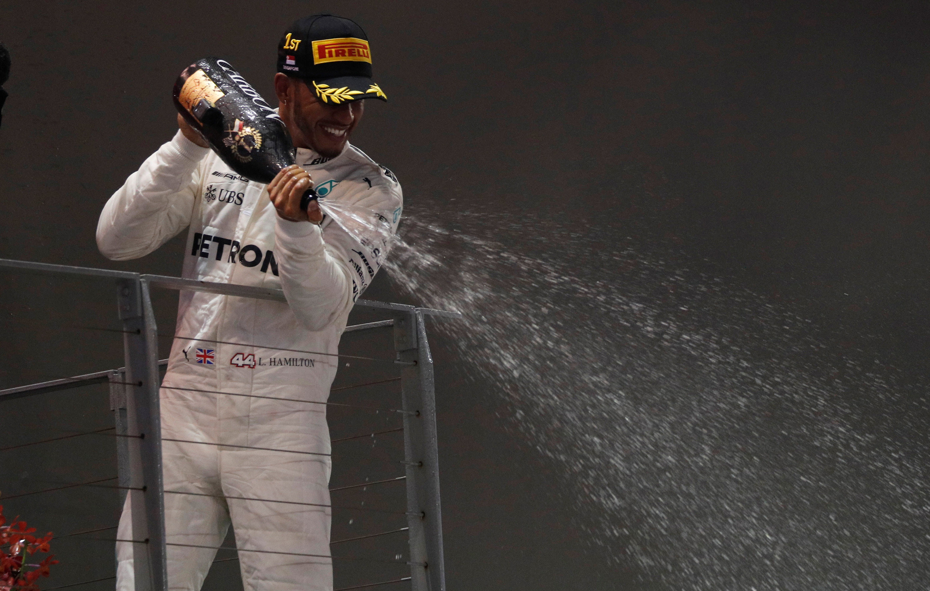 Supremacía. Lewis Hamilton tira champaña a su equipo y celebra un nuevo triunfo en esta temporada que lo tiene de líder.