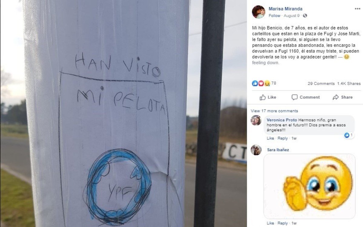 En la canción "Mi unicornio azul”, Silvio Rodríguez clama porque le den "cualquier información, que bien voy a pagar”, sobre el animalito que había dejado pastando, y desapareció. Y remata diciendo que "aunque tuviera dos, yo solo quiero aquel”. La analogía con lo sucedido a Benicio, un pibe tandilense de siete años, es sorprendente. Benicio había estado jugando en la plaza de su barrio. A esa hora de la tarde salían de la escuela sus amiguitos, a quienes fue a invitar, como hacia siempre, para jugar un picadito. Cuando volvió, la pelota ya no estaba. Tenía un par más en casa, pero esa, la extraviada, era su preferida. Se encerró en su cuarto a llorar, pero resolvió que no se quedaría atrapado en lágrimas. Dibujó una pelota similar a la suya y pegó cinco carteles en distintos puntos de la plaza. Preguntaba ¿han visto mi pelota? y abajo, dibujada, como puede dibujar un niño de siete años, la pelota, y un detalle que la distinguía, la leyenda YPF. "Chau, me voy a pegar unos carteles en la plaza”, dijo a su papá y a su hermano. Se fue con cuatro copias, las pegó y volvió. Al enterarse su madre, conmovida, quiso hacerle comprender que sería muy difícil que apareciera. Que jugara con las otras que tenía. Pero él, tercamente, se negaba "yo quiera ésa, no otra”. Entonces decidió ayudarlo por las redes sociales. Fue a la plaza, sacó una foto de uno de los carteles y escribió: "sí alguien se la llevó pensando que estaba abandonada, les encargo la devuelva a esta dirección”.