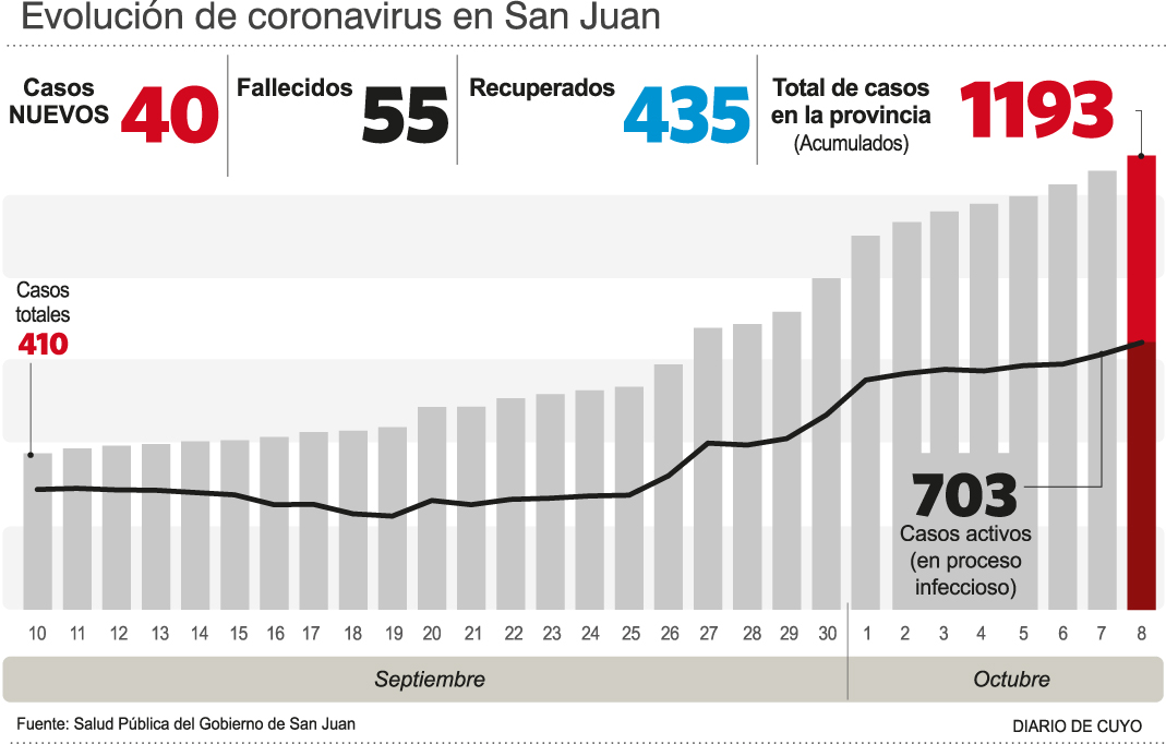 Por otro lado, Salud Pública informó que ayer murieron dos personas a causa de Covid. Se trata de un hombre de 81 años e internado con comorbilidades en el hospital Rawson, y una mujer de 87, quien residía en el segundo geriátrico y estaba en el Ventura Lloveras. De esta manera, los fallecidos ahora son 55; a la vez que confirmaron 40 nuevos casos, para sumar 1.193 (hay 703 pacientes con proceso infeccioso y 91 internados)