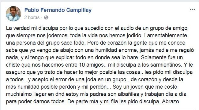 Los polémicos audios del concejal sarmientino Pablo Fernando Campillay siguen dando que hablar. A la fuerte repercusión en las redes sociales se sumó la publicación en un medio mendocino, entre otros, y hasta el comentario de un periodista de renombre nacional.