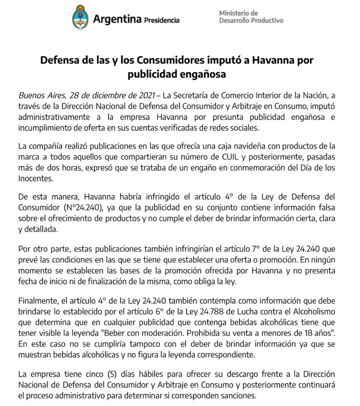 Desde el organismo nacional detallaron que las publicaciones de Havanna infringieron el artículo 4° de la Ley 24.240. "La publicidad en su conjunto contiene información falsa sobre el ofrecimiento de productos y no cumple el deber de brindar información cierta, clara y detallada", apuntaron.
