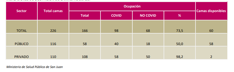 Por su parte, informaron que la ocupación de camas de Terapia Intensiva es de 73,5% entre el sector público y privado. En éste último, quedan disponibles dos plazas, teniendo un 98,2% del lugar ocupado entre enfermos con covid y con otras patologías. Finalmente, en el sector estatal quedan libres 58 camas y 40 que albergan a personas con coronavirus.