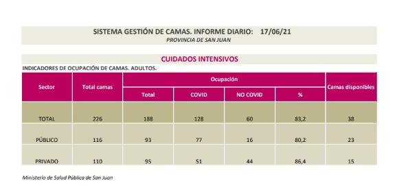 Se encuentran internados 279 pacientes en las áreas de COVID-19 (entre positivos y sospechosos) de los hospitales Dr. Guillermo Rawson; Dr. Marcial Quiroga; Dr. Ventura Lloveras, de Sarmiento; Dr. César Aguilar, de Caucete; Dr. José Giordano, de Albardón; Dr. Federico Cantoni, de Pocito; CEMEC; Dra. Julieta Lanteri; Hospital San Roque, de Jáchal; Hospital Dr. Alejandro Albarracín, de Valle Fértil; Hospital de Barreal, de Calingasta; Hospital Privado; Instituto Médico; Clínica El Castaño; Clínica Santa Clara; Sanatorio San Juan y CCI.