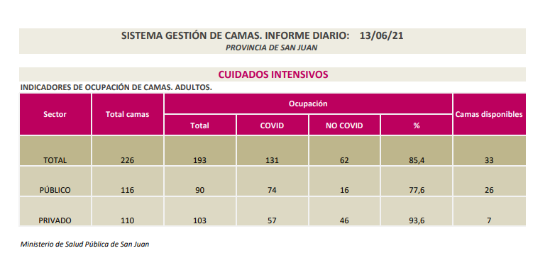 Este domingo, Salud Pública informó que la ocupación de camas de terapia intensiva es de 85,4% en el sector púbico y privado. Además, informaron que del total de internados, hay 2 embarazadas y cuatro niños con coronavirus.
