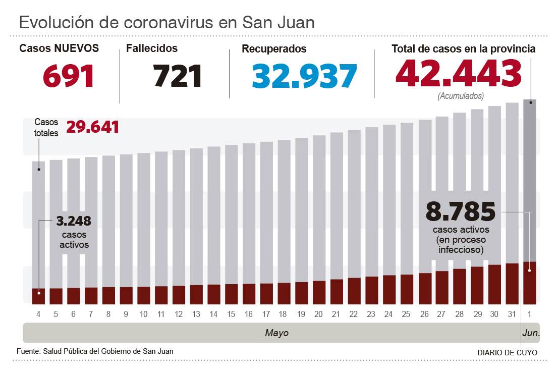Por otro lado, hubo 691 nuevos casos de coronavirus y el acumulado ahora se eleva a 42.443 personas contagiadas. De ellas, hay 8.785 casos activos, es decir, con infección en curso; y de los 296 internados fueron informados cuatros embarazadas y cinco pacientes pediátricos.