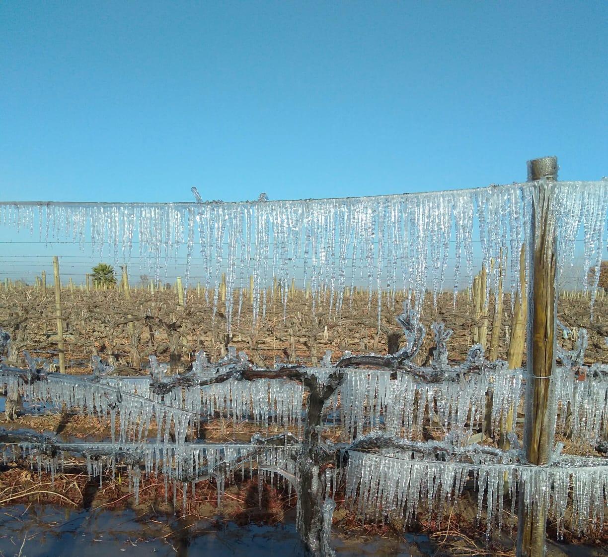 En esta semana en la región de Cuyo se registraron temperaturas bajo cero que afectaron a frutales. En la zona del Valle de Uco y San Rafael, Mendoza, los cultivos de almendros, ciruelos y durazneros recibieron heladas de 5 o más grados bajo cero. Productores realizaron lucha contra heladas con riego por aspersión y quemadores de combustible. En el sur del departamento Sarmiento las temperaturas fueron extremas afectando las yemas de algunos espalderos de vid y en "Campogrande del Acequión" el cultivo de granadas fue severamente afectado (fotos).
