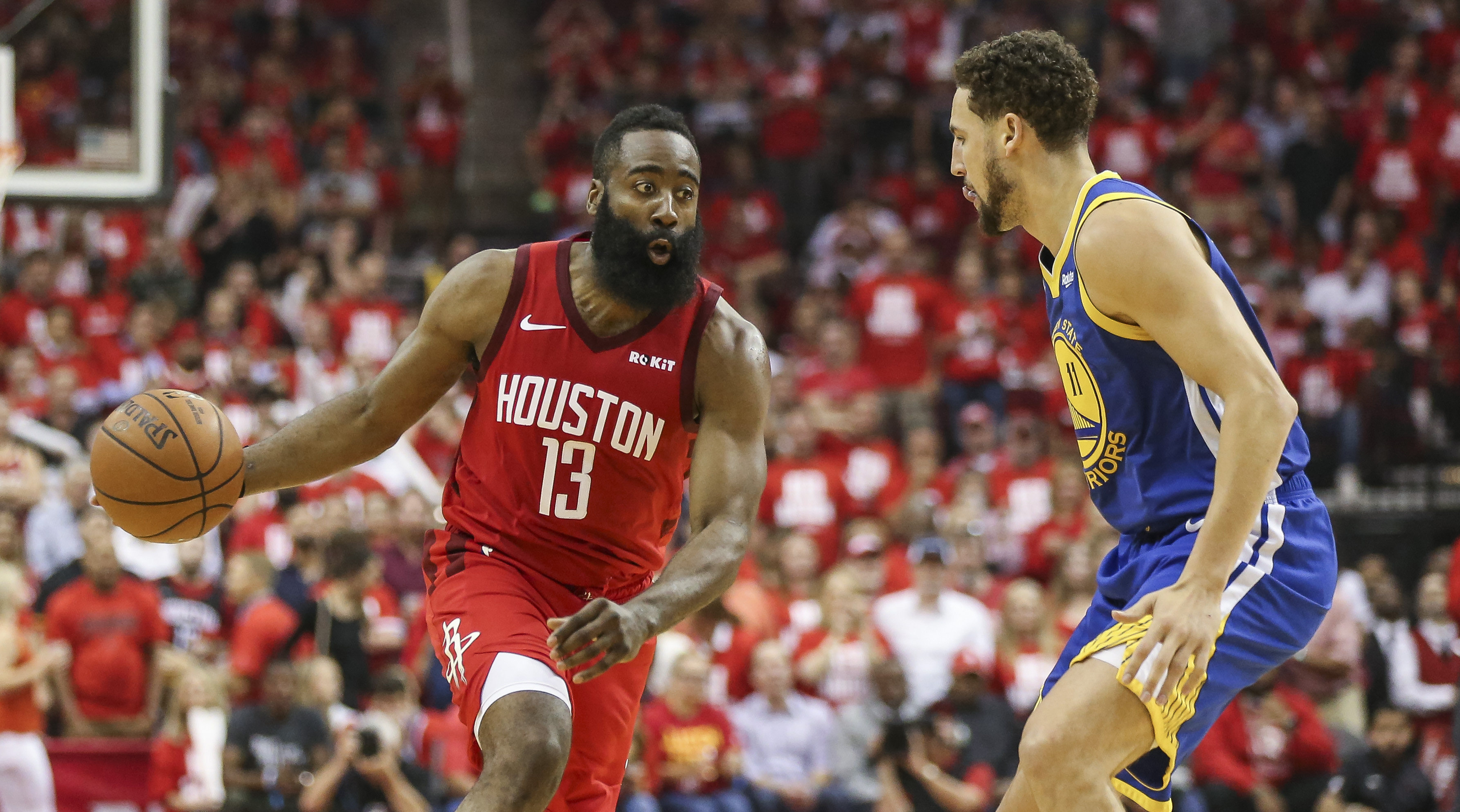 Harden anotó 13 de 29 tiros de campo, incluidos 6 de 17 de triples, y 6 de 8 desde la línea de personal. Kevin Durant con 34 puntos, siete rebotes y cuatro asistencias volvió a ser el líder de los Warriors.