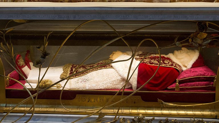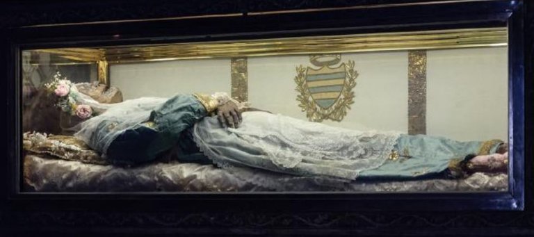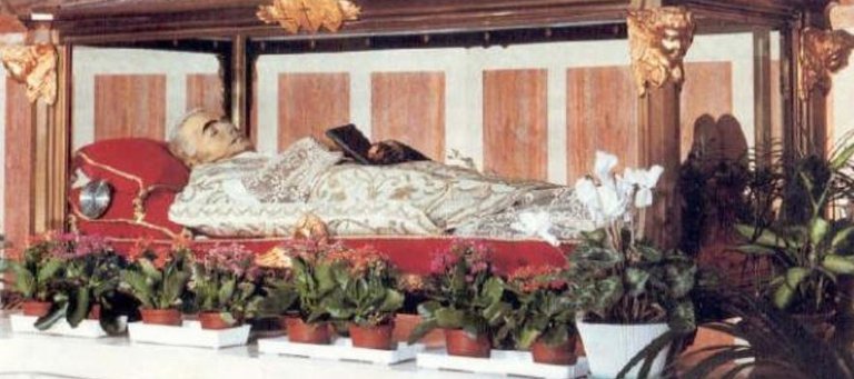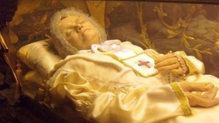 Es decir que no está “intacto” sino “bien conservado” dentro del esperable. Y lo que causó tanto asombro y malinterpretación es su cuerpo cubierto con cera y silicona para la veneración de los fieles.