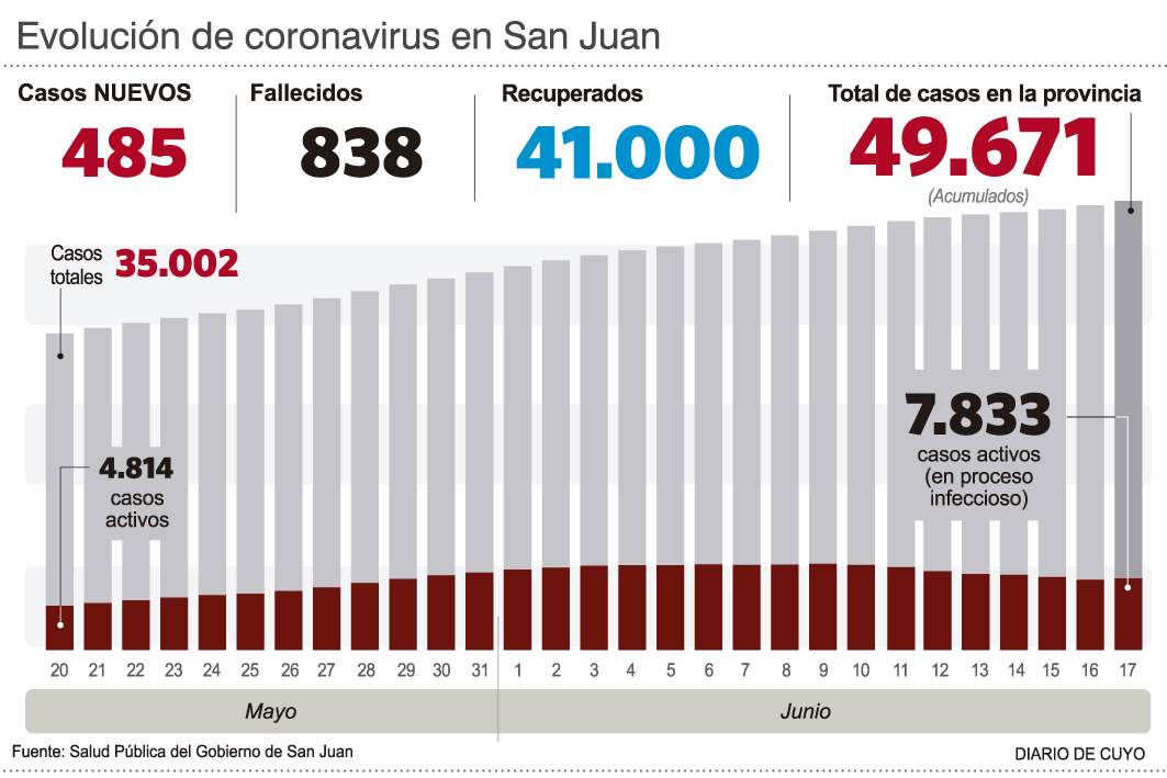 Por otro lado, detectaron 485 nuevos casos y el acumulado ahora es de 49.671 infectados, por lo que de mantenerse la cantidad diaria de confirmaciones, que superan las cuatro centenas, probablemente en la jornada de hoy San Juan alcance 50.000 personas contagiadas.