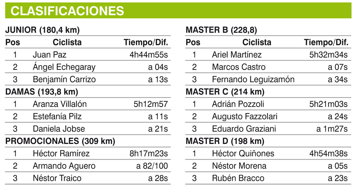 La otra categoría que cambió de manos en el último parcial fue la de los más pibes. En los Juniors el último esfuerzo fue para Santiago Sánchez, que terminó cuarto en la general ganada por el bonaerense Juan Paz.