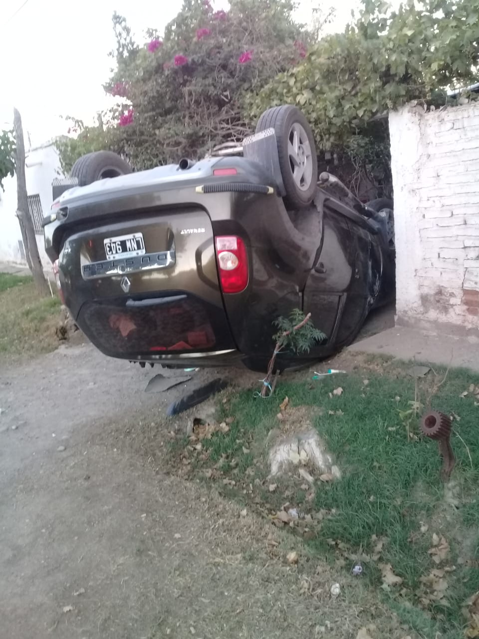 Un espectacular accidente se produjo alrededor de las 19:30 de este jueves en el interior de la Villa Rodríguez Pinto, en el departamento Rivadavia. Chocaron dos vehículos y uno de ellos terminó volcado, acabando su raid en el portón de una vivienda, sin ocasionar daños a los moradores.
