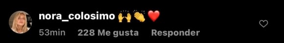 Entre los comentarios de la publicación no podía faltar el de Nora Colosimo, su suegra, madre de Wanda y abuela de sus hijas, quien le mostró su apoyo y festejó su vuelta a la cancha.