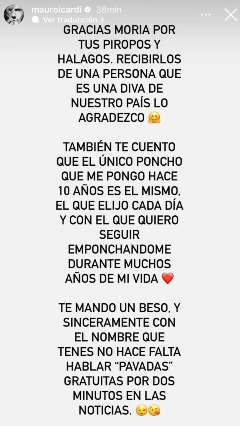 Lo cierto es que, al enterarse de las palabras de la Casán, Mauro decidió responder desde Estambul. “Gracias Moria por tus piropos y halagos. Recibirlos de una persona que una diva de nuestro país, lo agradezco”, comenzó diciendo. Y siguió: “También te cuento que el único poncho que me pongo hace 10 años es el mismo. El que elijo cada día y con el que quiero seguir empochándome durante muchos años de mi vida. Te mando un beso. Y sinceramente, con el nombre que tenés, no hace falta hablar pavadas gratuitas por dos minutos en las noticias”.