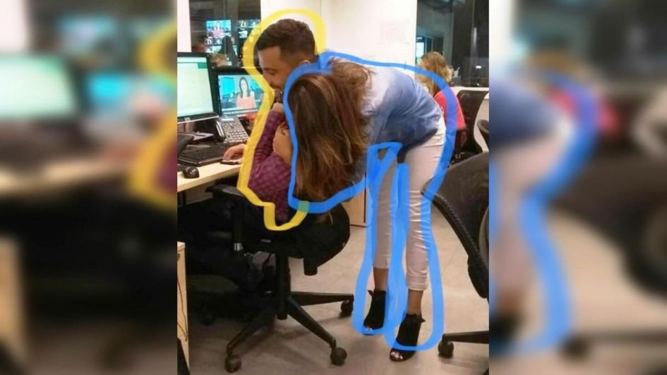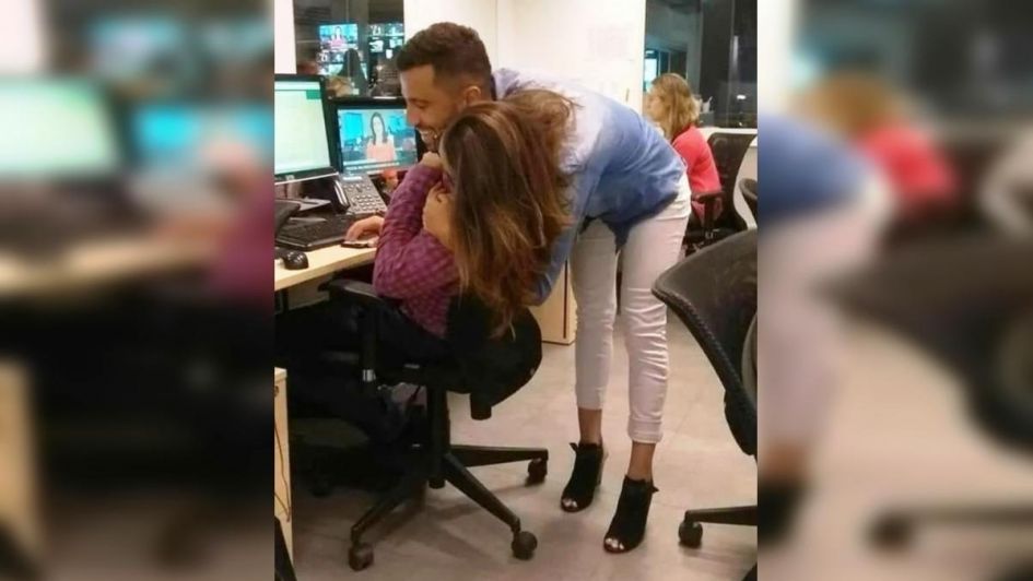 La imagen de dos compañeros de trabajo que se abrazan se convirtió en un fenómeno viral en las redes sociales y confunde a más de uno. A primera vista, el muchacho parece estar de pie usando tacones, pero la realidad es completamente diferente.