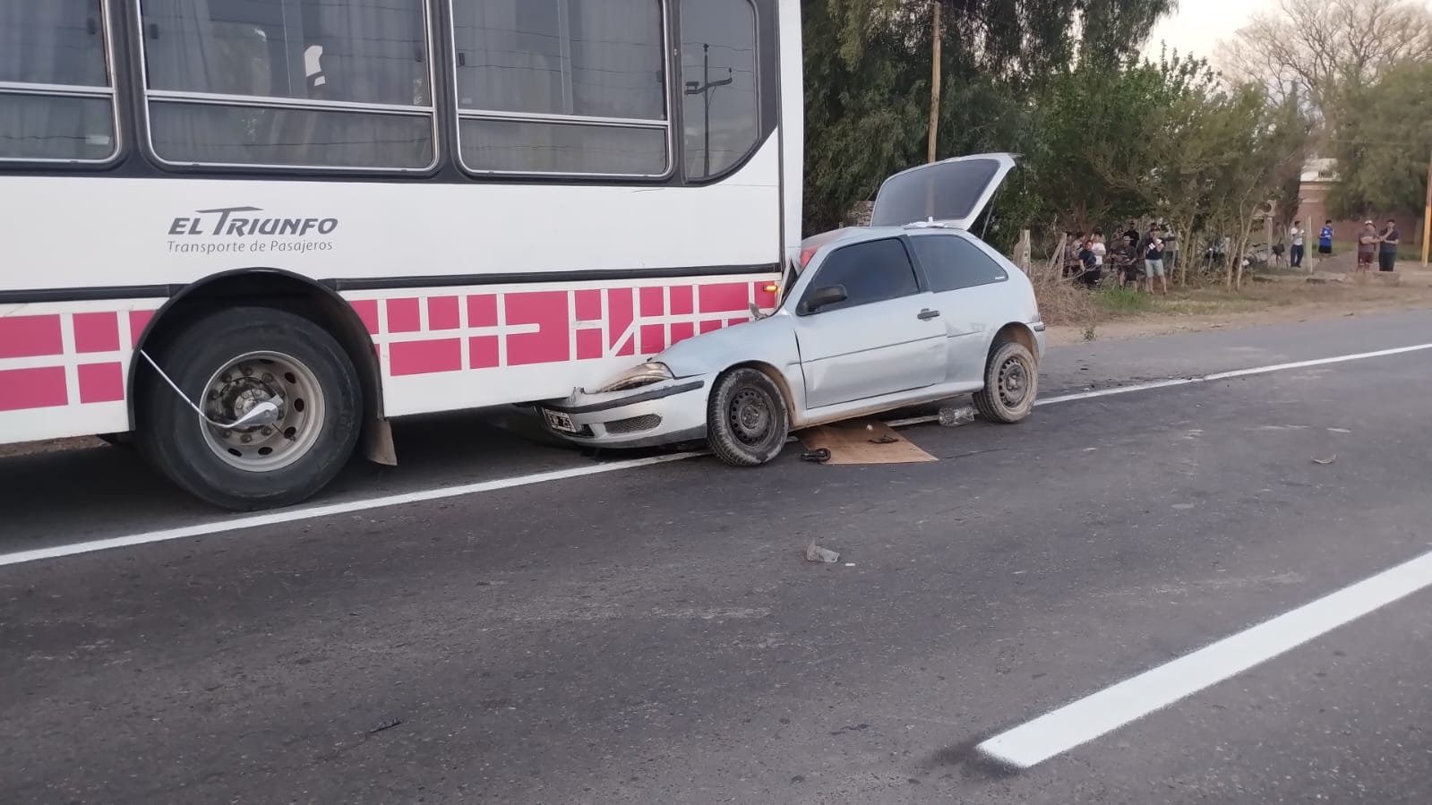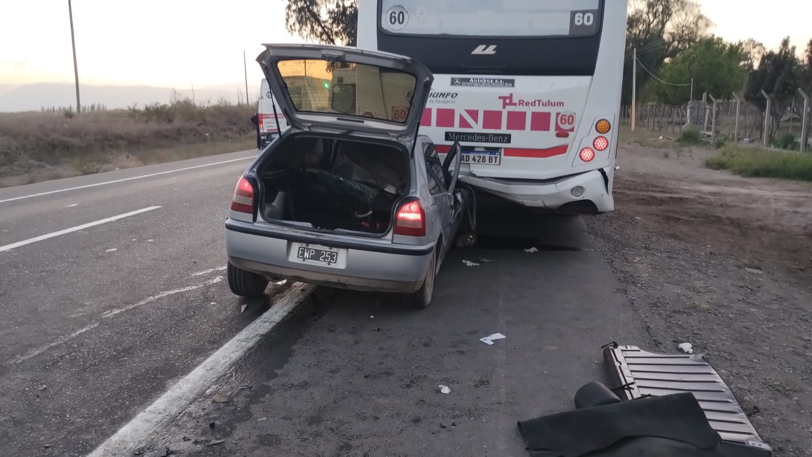 El siniestro ocurrió pasadas las 18.40 horas de este sábado en Ruta 20 antes de San Isidro en cercanías al puente de Caucete.La principal hipótesis es que el micro frenó y el auto no pudo evitar el impacto.