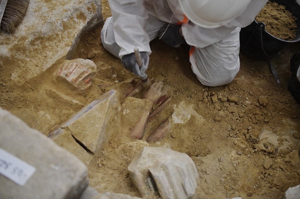 Este martes, a apenas unos centímetros de la superficie, un arqueólogo limpiaba con delicadeza unas manos talladas y extendidas, como implorando.
