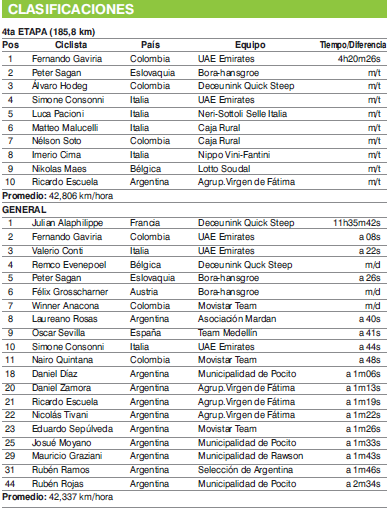 El velocista colombiano Fernando Gaviria (UAE Emirates) se quedó con la cuarta etapa, 185,8 kilómetros que unieron San José de Jáchal y San Agustín de Valle Fértil. La victoria le permitió achicar a 8 segundos la distancia que lo separa del francés Julian Alaphilippe (Deceunink Quick Steep) líder de la Vuelta.