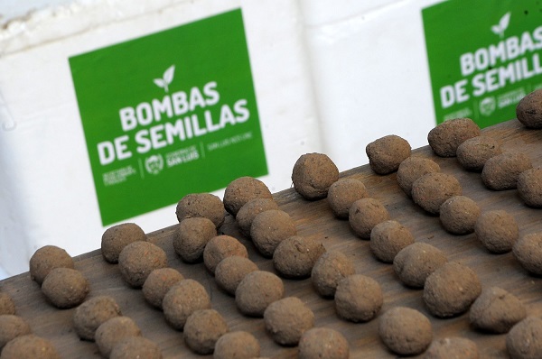 Las bombas verdes, se componen de arcilla, tierra, compost y semillas y son elaboradas por trabajadores de la cartera ambiental y beneficiarios del Plan de Inclusión Social, quienes han producido 50 unidades, que darán vida y cobertura vegetal con árboles de caldén, algarrobo, entre otras especies autóctonas.