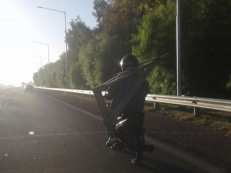 Un lector envió una imagen y el siguiente comentario: “Este señor circulando en la avenida con esta estructura de madera, e sun peligro para él y para los automovilistas”.