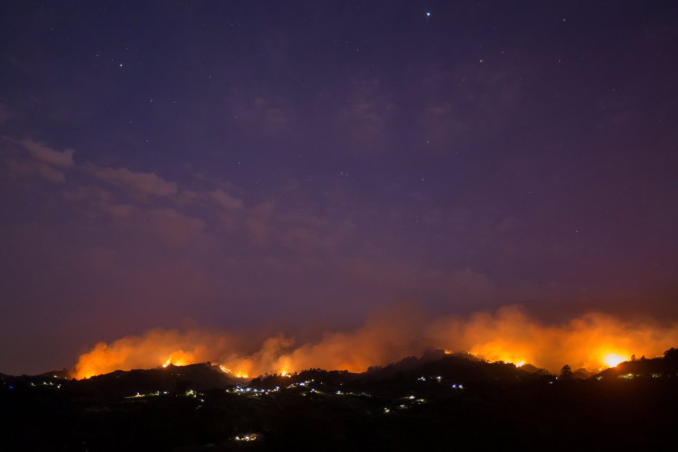Las condiciones atmosféricas favorecen la propagación del fuego por barrancos muy estrechos de una zona elevada y dificultan la extinción: temperaturas altas, vientos cambiantes de unos 50 kilómetros por hora y una humedad inferior al 30 por ciento.