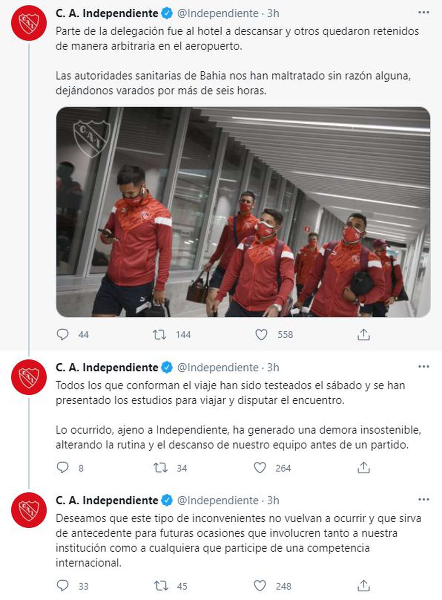 “La delegación de Independiente continúa retenida en el Aeropuerto de Salvador. A pesar de haber presentado toda la documentación requerida, las autoridades sanitarias no dan respuesta y han generando una demora de más de cinco horas, sin proveer agua ni comida para los presentes”, se apuntó desde la cuenta oficial del club de Avellaneda en Twitter.
