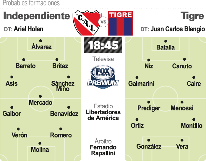 Independiente, con un equipo integrado por suplentes y juveniles, recibirá hoy a Tigre, penúltimo en la tabla de promedios para el descenso, ya que el próximo martes jugará el partido revancha ante River Plate por los cuartos de final de la Copa Libertadores de América. El encuentro, válido por la séptima fecha de la Superliga Argentina de Fútbol, se llevará a cabo en el estadio Libertadores de América a partir de las 18.45, con el arbitraje de Fernando Rapallini y televisación de Fox Sports Premium. Al igual que el entrenador riverplatense, Marcelo Gallardo, el director técnico del "Rojo", Ariel Holan, apostará por un equipo alternativo ya que reservará a los titulares para el compromiso de la Libertadores, el principal objetivo de los de Avellaneda en este semestre.