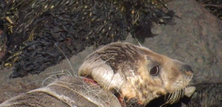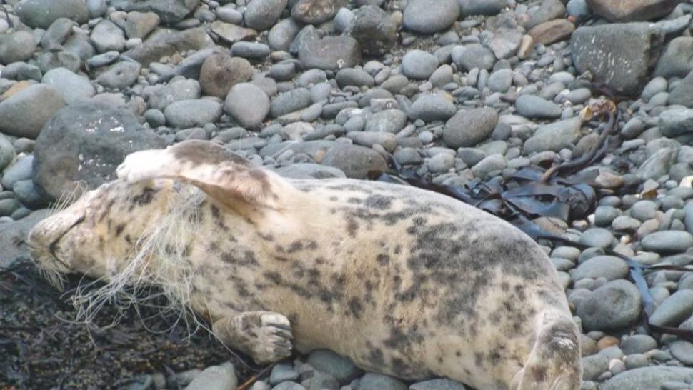 Un hombre tomó fuertes imágenes de una foca estrangulada por una red de plástico, al borde de la muerte, en una playa de Pembrokeshire, al sur de Gales.