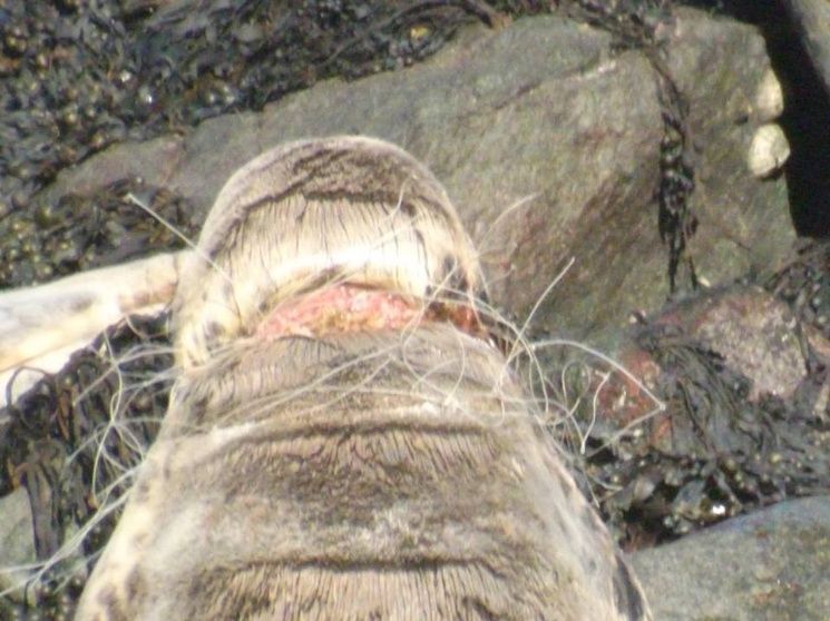 Sharon Lawrence notó que el animal estaba estrangulado por una red plástica y que tenía impactantes heridas en el cuello, por lo que avisó a las autoridades y tomó fotografías.