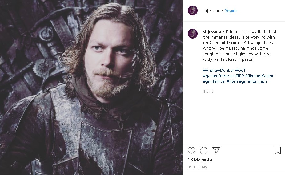 Pamela Smyth directora de Crowd Makeup de GOT expresó: ”Ayer por la mañana escuchamos la horrible noticia de que perdimos a un integrante de nuestra familia Thrones. Andrew Dunbar era una joya absoluta, divertido y encantador”. ”Siempre profesional y educado con una radiante sonrisa en el rostro. Un alma muy bella, toda la familia de GOT lo extrañara mucho” concluyó.