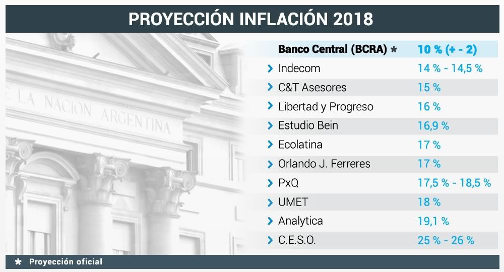 Si bien el presidente del Banco Central (BCRA), Federico Sturzenegger, aseguró en el último Informe de Política Monetaria que "el proceso de desinflación sigue", especialistas proyectan una inflación para 2018 entre el 14% y el 19%, por encima de la meta del 8%-12% planteada por la entidad monetaria. En todos los casos, dan cuenta de una composición de la inflación anclada en un aumento de tarifas encabezado por energía y transporte.