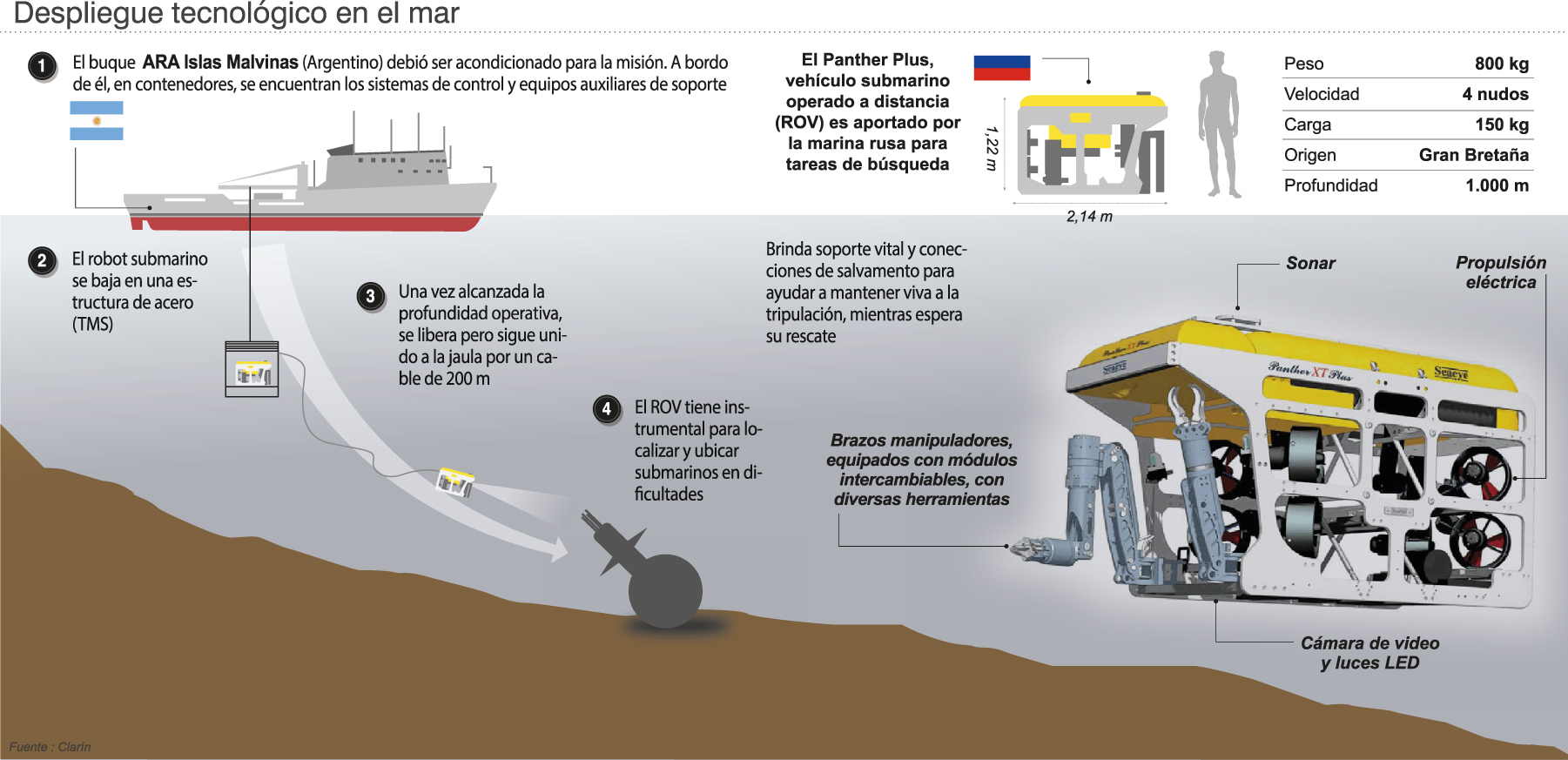 En la actual etapa de búsqueda del ARA San Juan, el equipo que envió Rusia para formar parte del operativo cumple un rol clave. Las expectativas están puestas en el vehículo sumergible no tripulado de ese país denominado Pantera Plus, que según las previsiones de la Armada bajará este sábado a 477 metros de profundidad para verificar uno de los cuatro posibles “indicios” del submarino desaparecido detectados por sonares de barcos que están en el área de rastrillaje.