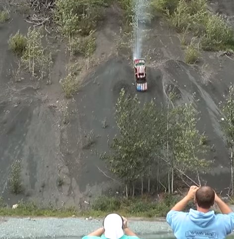 Es por eso que en Glacier View, en donde a esta altura del año el sol se pone a las 11 de la noche y amanece a las 4.30, encontraron una manera muy particular de festejar: lanzan autos y camionetas desde un precipicio.