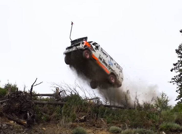 Los organizadores usan un método bastante rudimentario pero efectivo: traban la dirección y ponen un tronco sobre el acelerador para enviar el vehículo hacia una pequeña rampa de tierra que lo hará despegar hacia el vacío.