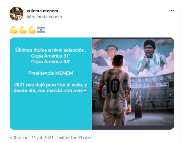 “Últimos títulos a nivel selección: Copa América ‘91, Copa América ‘93. Presidencia de MENEM. 2021 nos dejó para irse al cielo y desde ahí nos mandó otra más”, escribió Zulemita dando a entender que su padre había contribuido al triunfo de la Selección.