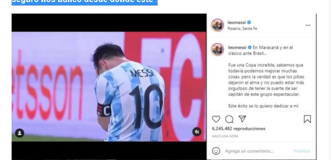 “En Maracaná y en el clásico ante Brasil… Fue una Copa increíble, sabemos que todavía podemos mejorar muchas cosas, pero la verdad es que los pibes dejaron el alma y no puedo estar más orgulloso de tener la suerte de ser capitán de este grupo espectacular”, escribió el ’10′ en su cuenta de Instagram, horas después de arribar a su ciudad natal de Rosario.