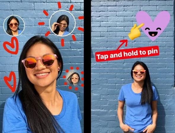 Stickers de selfies. Esta opción permite sacarse una selfie y convertirla en un sticker que se puede añadir a las fotos y videos. Al tomar una foto o grabar un video, si se hace click en la cara sonriente se verá un nuevo sticker con el ícono de una cámara.