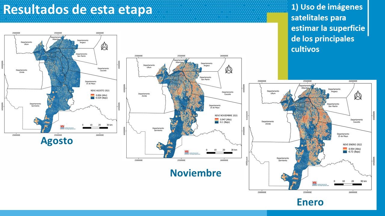 Según explicó Ruíz, "se usaron imágenes satelitales para estimar la superficie de los principales cultivos". Con ellas, se identifican distintas coberturas, sigue su evolución temporal y se genera información para su consulta". Así, "se generó información precisa para más del 90% de la superficie cultivada de los Valles de Tulum, Ullum y Zonda", afirmó Ruiz, agregando con ello se logró el "cálculo del consumo hídrico de los principales cultivos¦; y se determinaron las "necesidades hídricas del Valle de Tulum, Ullum y Zonda".
