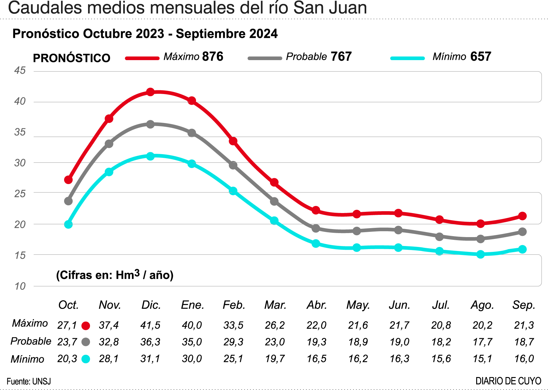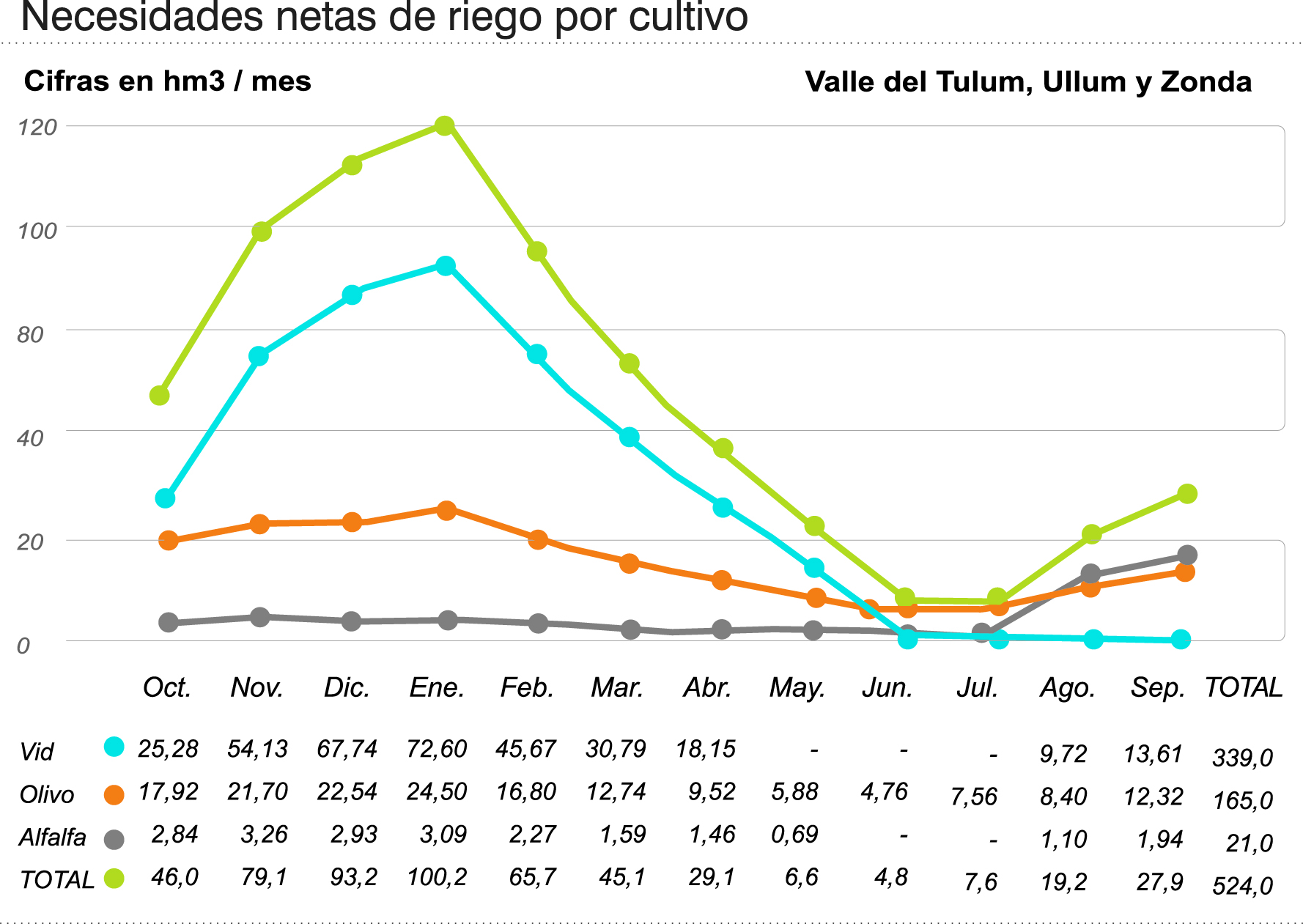 Así, con un requerimiento de agua para riego del orden de los 700 hectómetros cúbicos del 80% de los cultivos del Valle de Tulum, Ullum y Zonda estimado por el INTA San Juan; "tendremos unos 767 hectómetros cúbicos anuales como derrame hídrico anual más probable en el principal curso de agua local. El máximo probable sería de unos 876 y el mínimo, de 657", indicó Dölling recientemente al anunciar su pronóstico el pasado 29 de septiembre en el evento coorganizado por Suplemento Verde de DIARIO DE CUYO junto a la UCCuyo entro otras instituciones".
